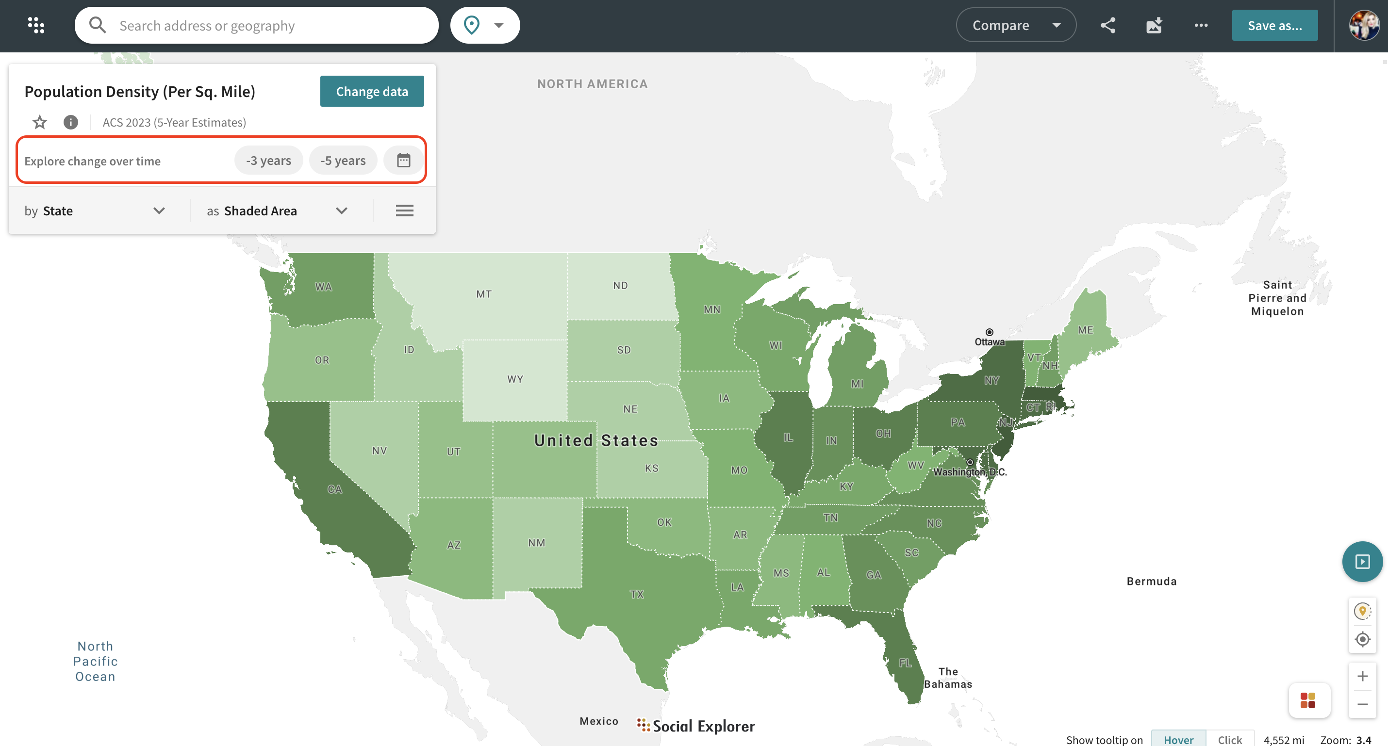 To view change over a 3-year or 5-year period of time for a particular data variable, you can now select the options directly from the Change data menu. Click on the 3-year period or 5-year period options to do so. Click on X to turn off the selected option.
