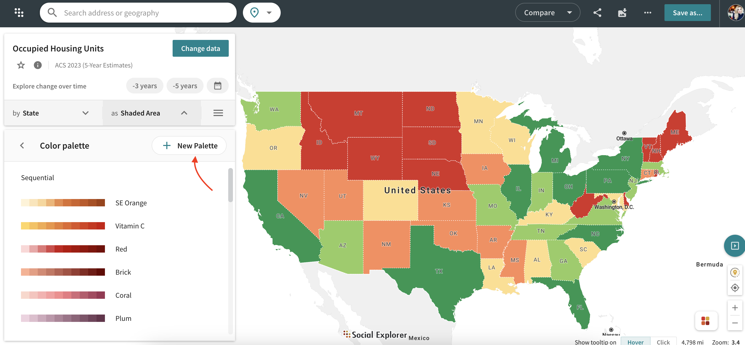 You can create your own custom color palettes on Social Explorer to personalize your maps. There are two ways in which to create your custom color palettes: