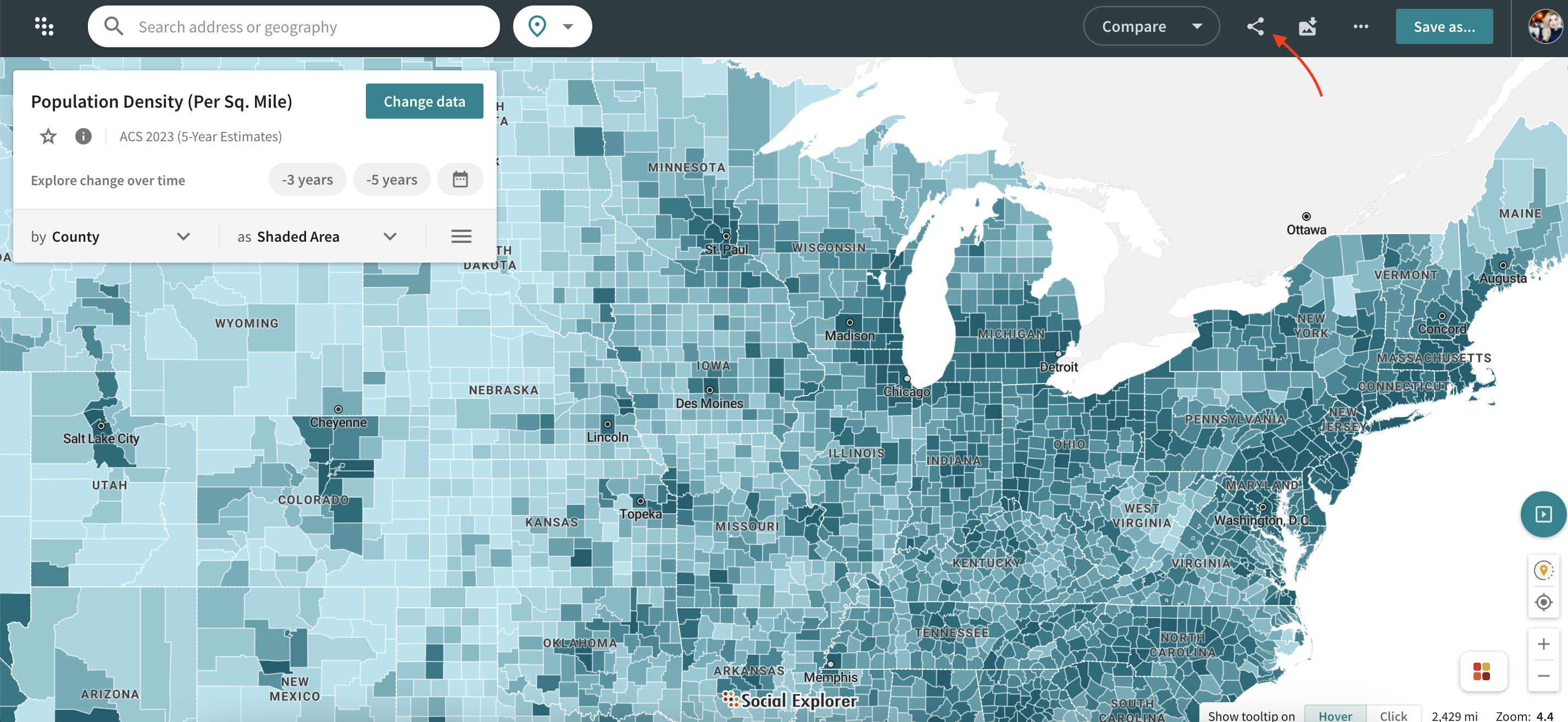 - Click on Copy Link or one of the social media icons to share your map directly to the social network of your choice.