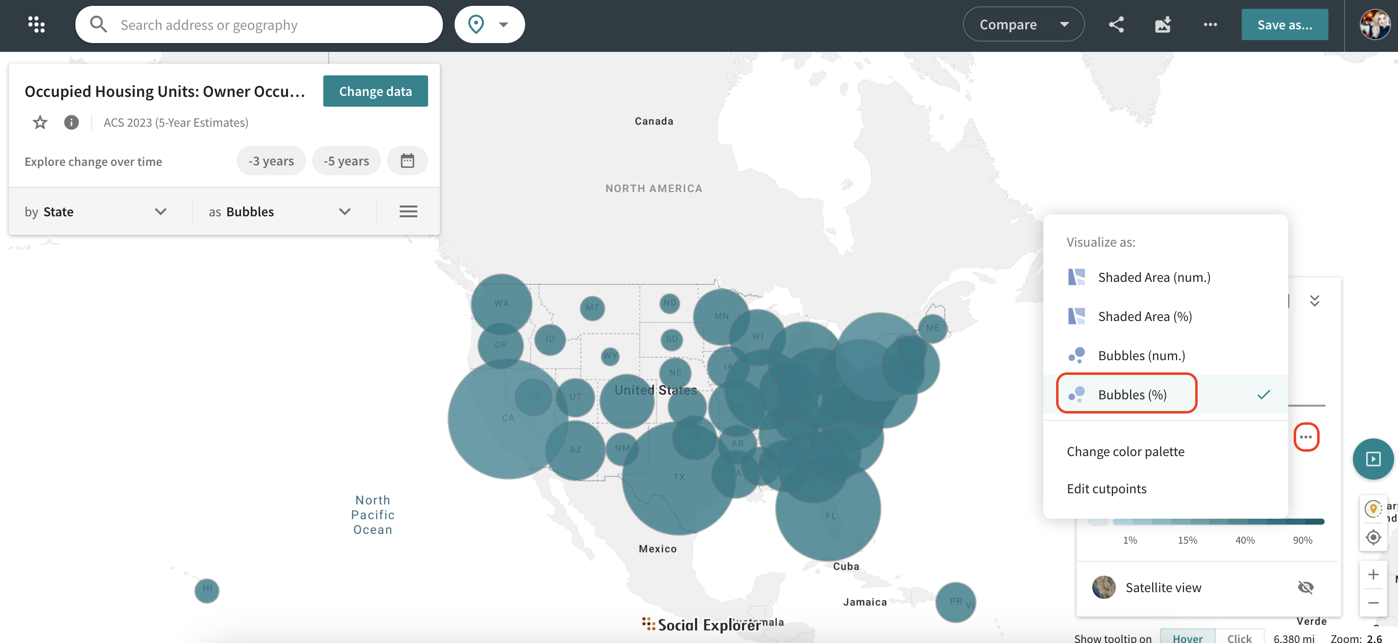 - To switch to a bubble visualization by percentage, select "Bubbles (%)" (outlined in red in the image).