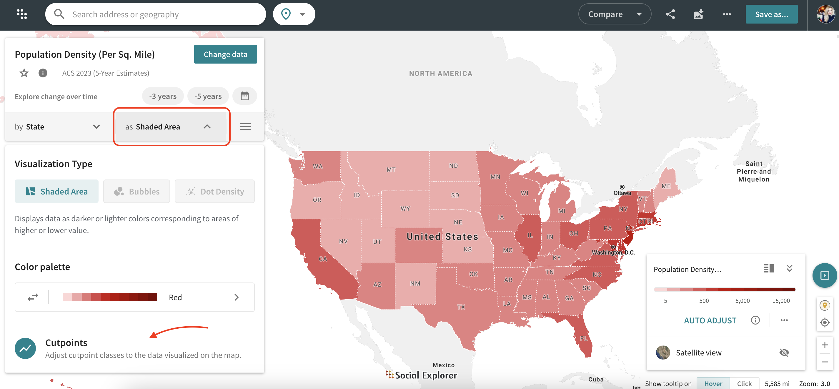 Note: The map legend is now a separate component located in the bottom right corner of your screen. You can switch between different legend modes: minimized, maximized, detailed, and simplified. You can also edit your cutpoints and switch to satellite view or auto-adjust your shaded area and bubble maps directly from the map legend. |