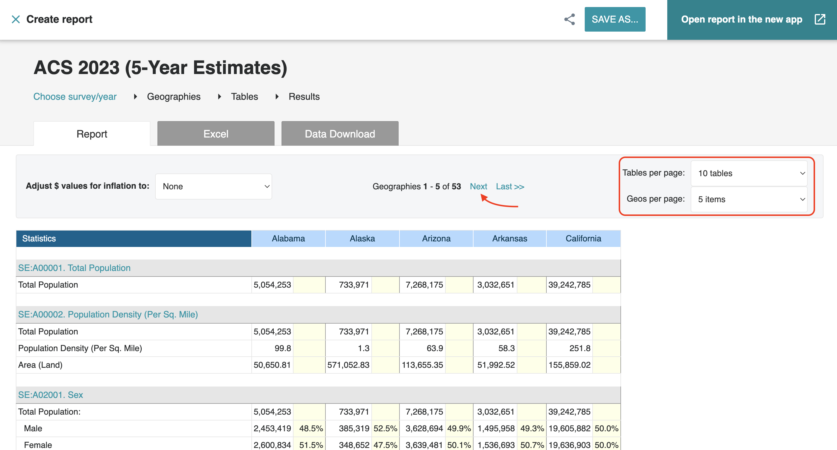 - In the upper-right corner, you can select the number of tables and geographies to display per page. Click on the dropdown menus to change these settings.