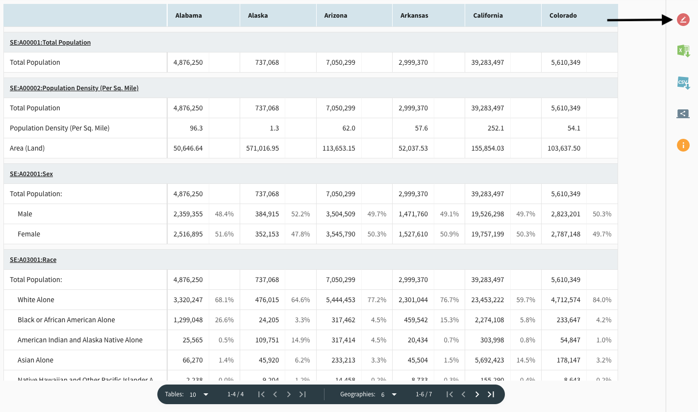 Note: We’ve disabled these functionalities for certain datasets. For instance, we have not enabled change over time for decennial census data because the data is not completely normalized. In that case, you’ll notice the info button icon next to the survey name in your created report to indicate this. |
