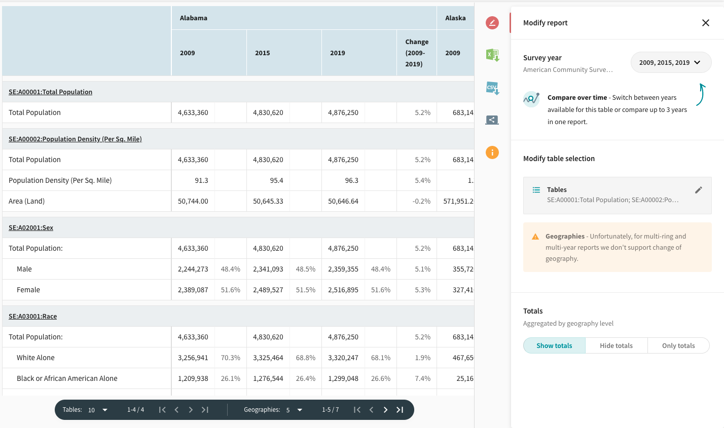 This feature lets you change years while keeping your preselected geographies and tables, eliminating the need to manually recreate reports for different years.