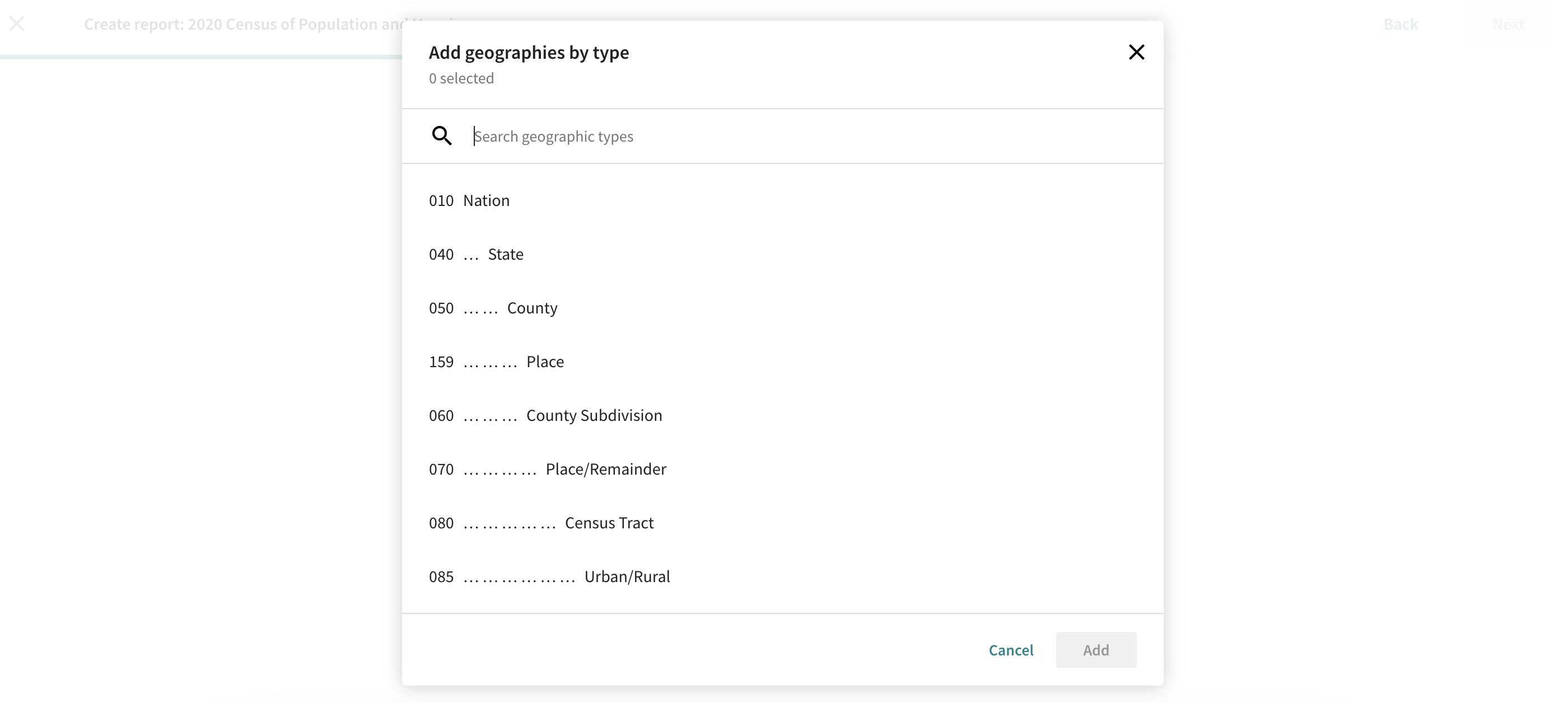 - Select one or multiple geographies. You can mix different types (e.g., Nation, County, Place) in one report.