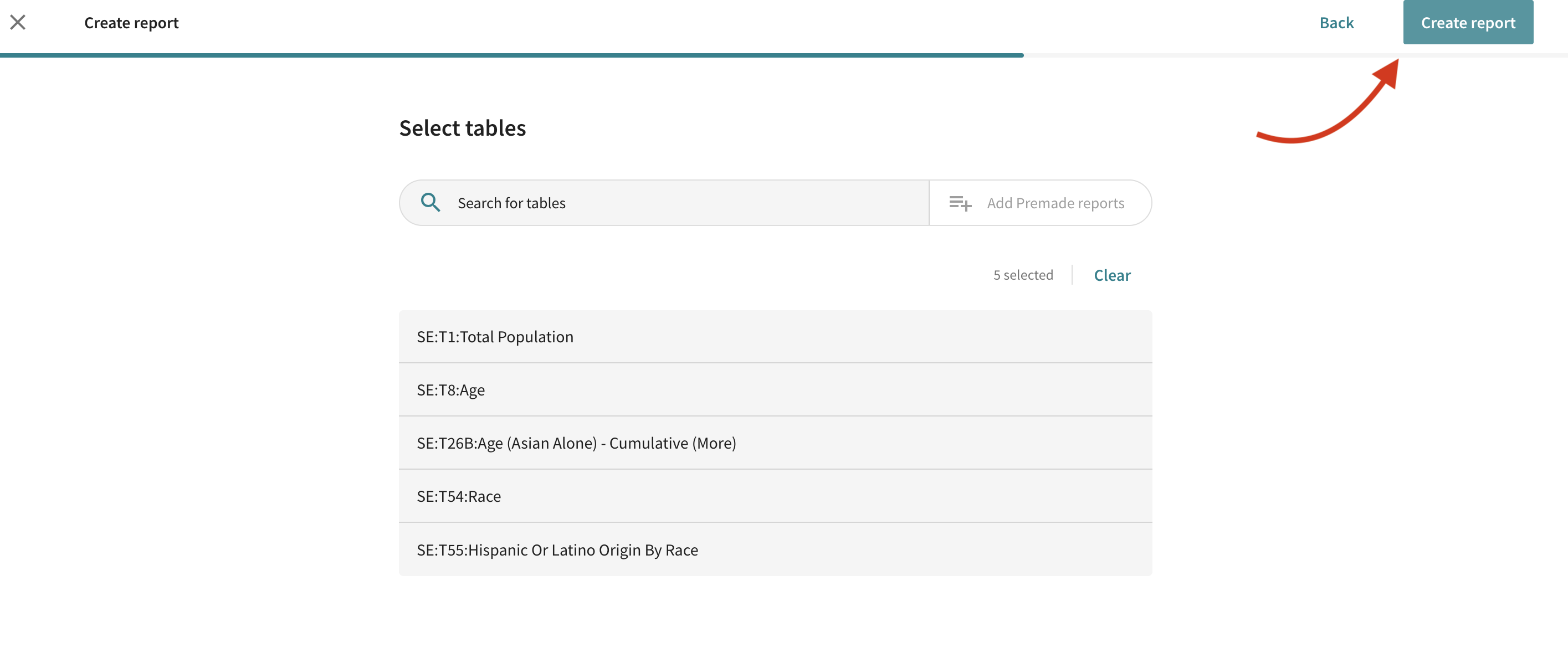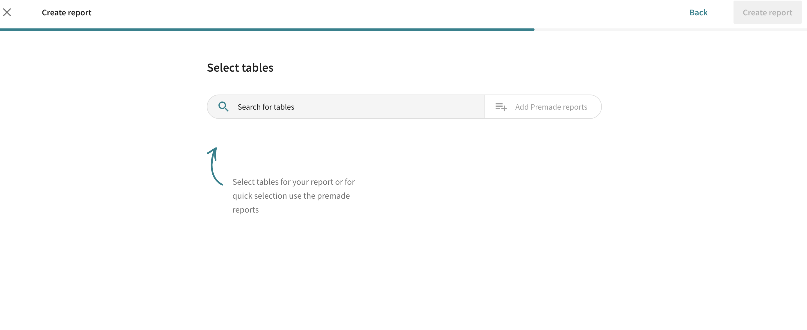 On the Select tables page, use the search bar to find tables or click Add Premade reports for quick bundles.