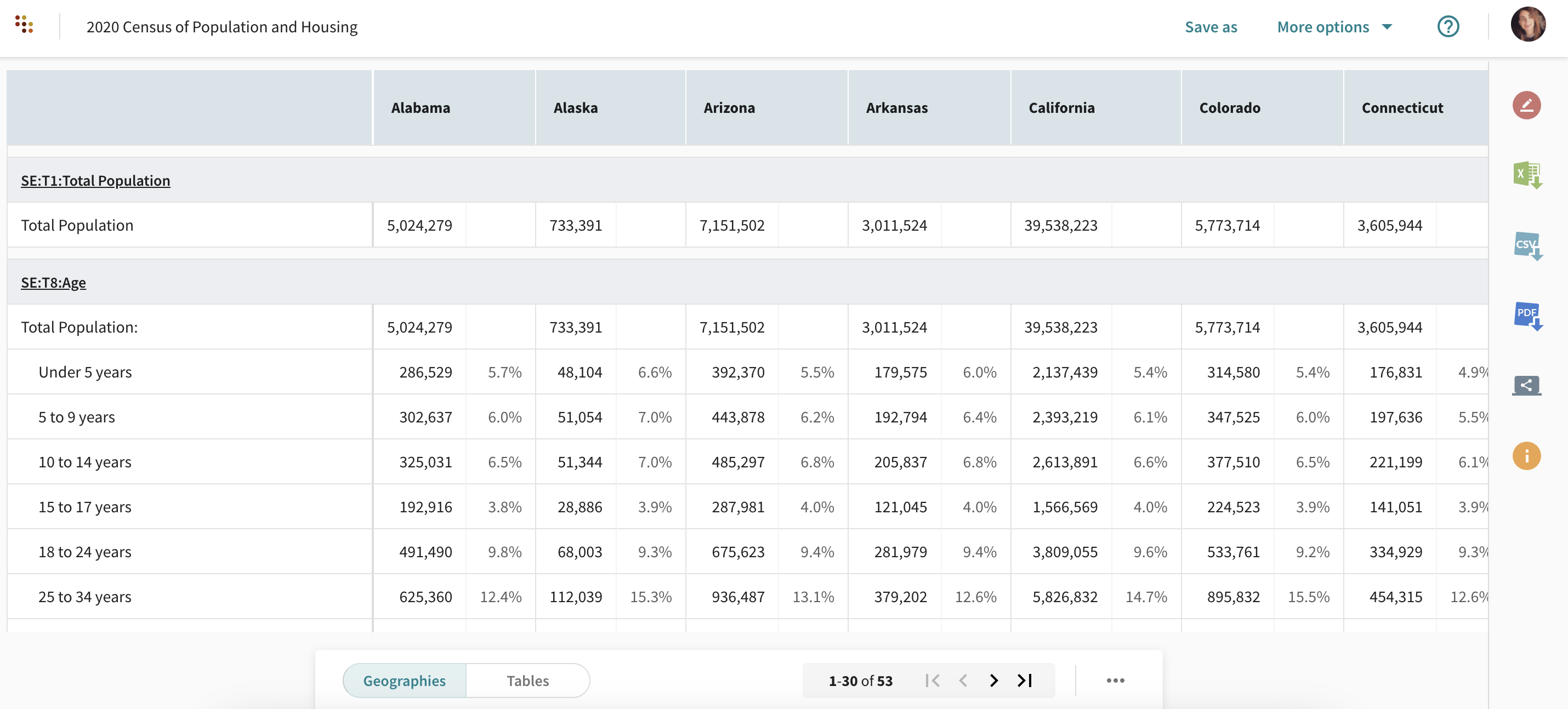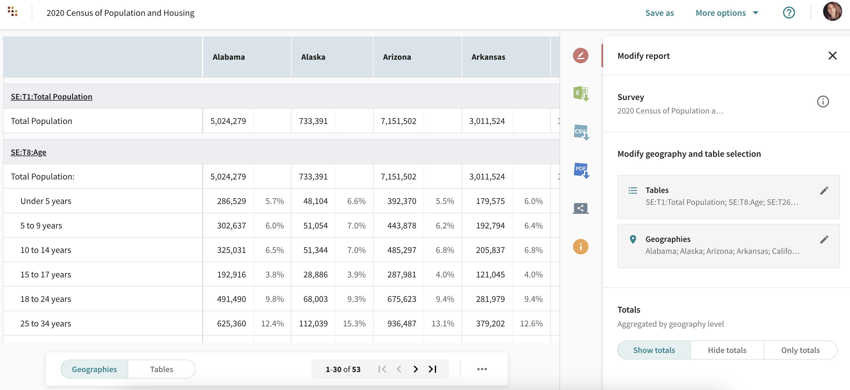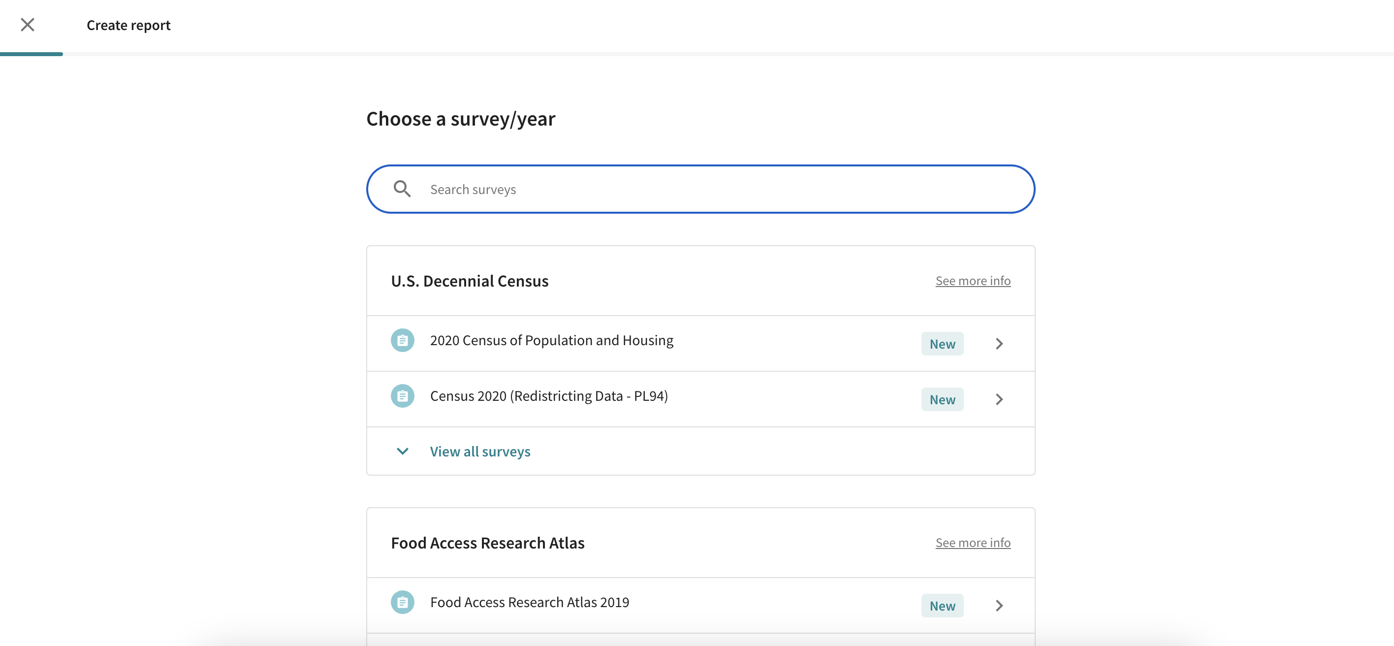With our updated Reports tool, creating reports is faster and more flexible. You can choose surveys, select geographies, and add tables in just a few steps. Once created, reports can be saved, modified, downloaded, or shared.