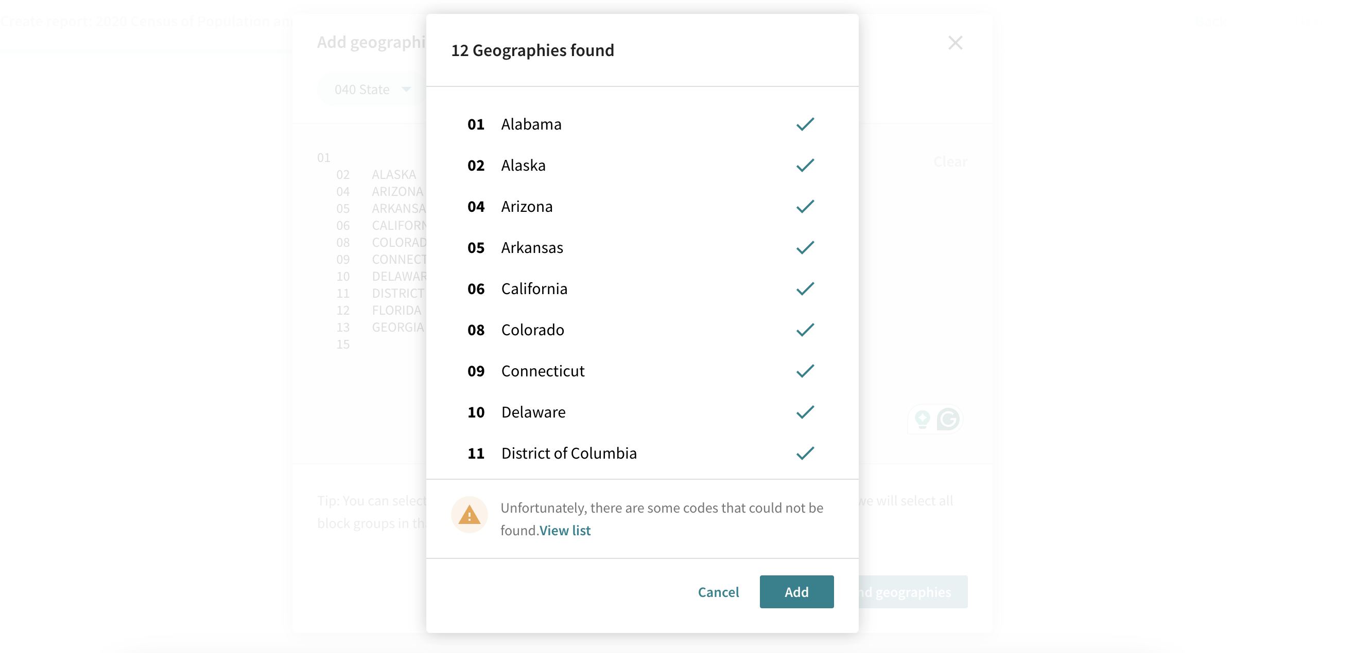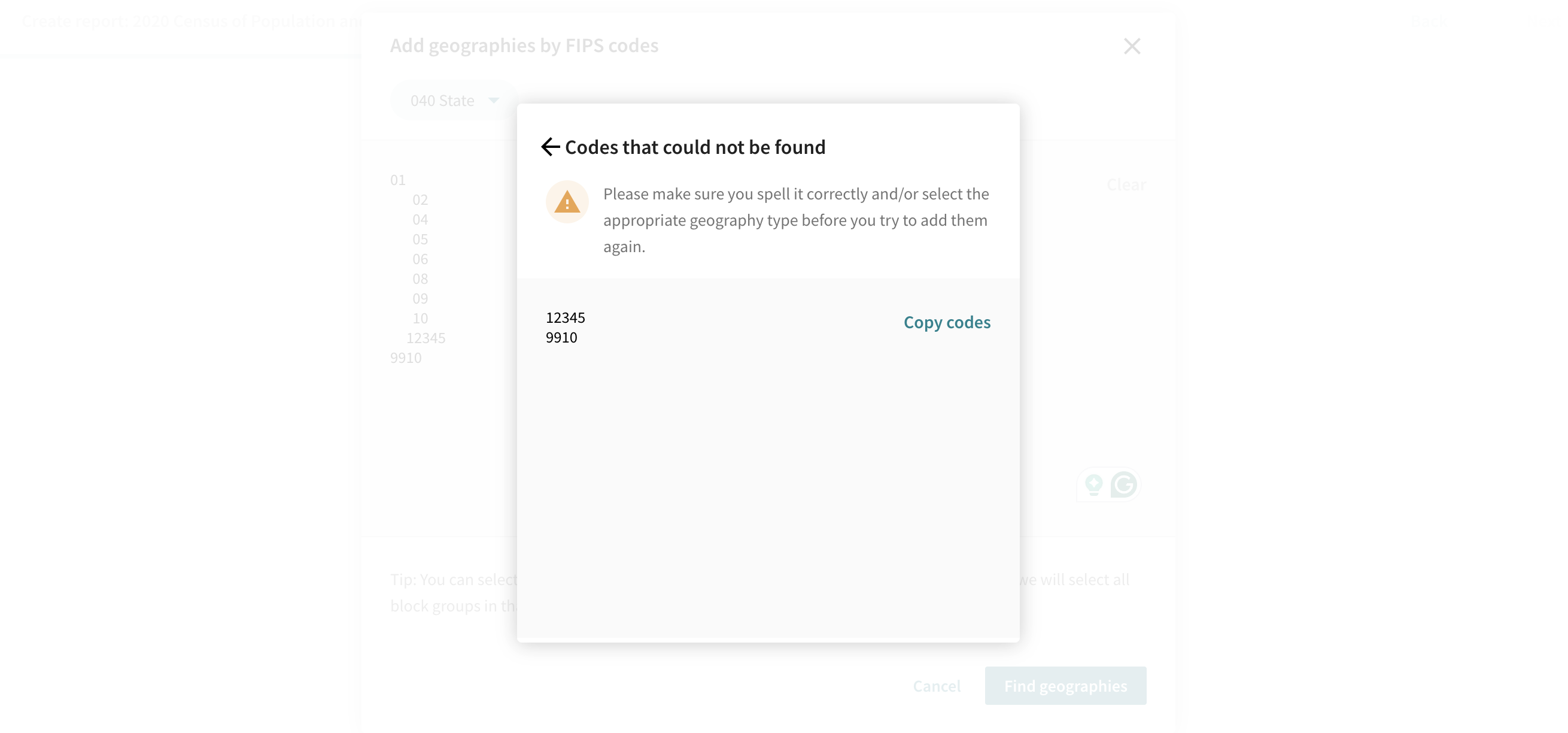 If you have a concrete list of FIPS codes, especially for nested geographies, this is the easiest way to load them into your report. Instead of manually searching and selecting areas, you can simply copy and paste the list of codes.