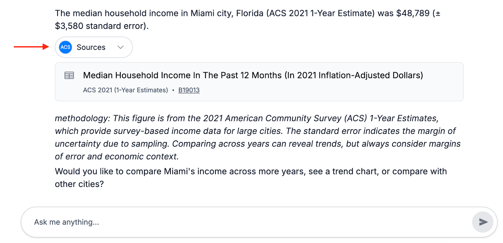 The Sources panel makes every AI answer transparent, reproducible, and academically credible. Users can trace each value back to the original source, understand dataset limitations, and ensure that the selected dataset aligns with their analytical goals. Whether the query involves a single estimate or a multi-geography comparison, the Sources panel guarantees that the research process remains fully documented and verifiable.
