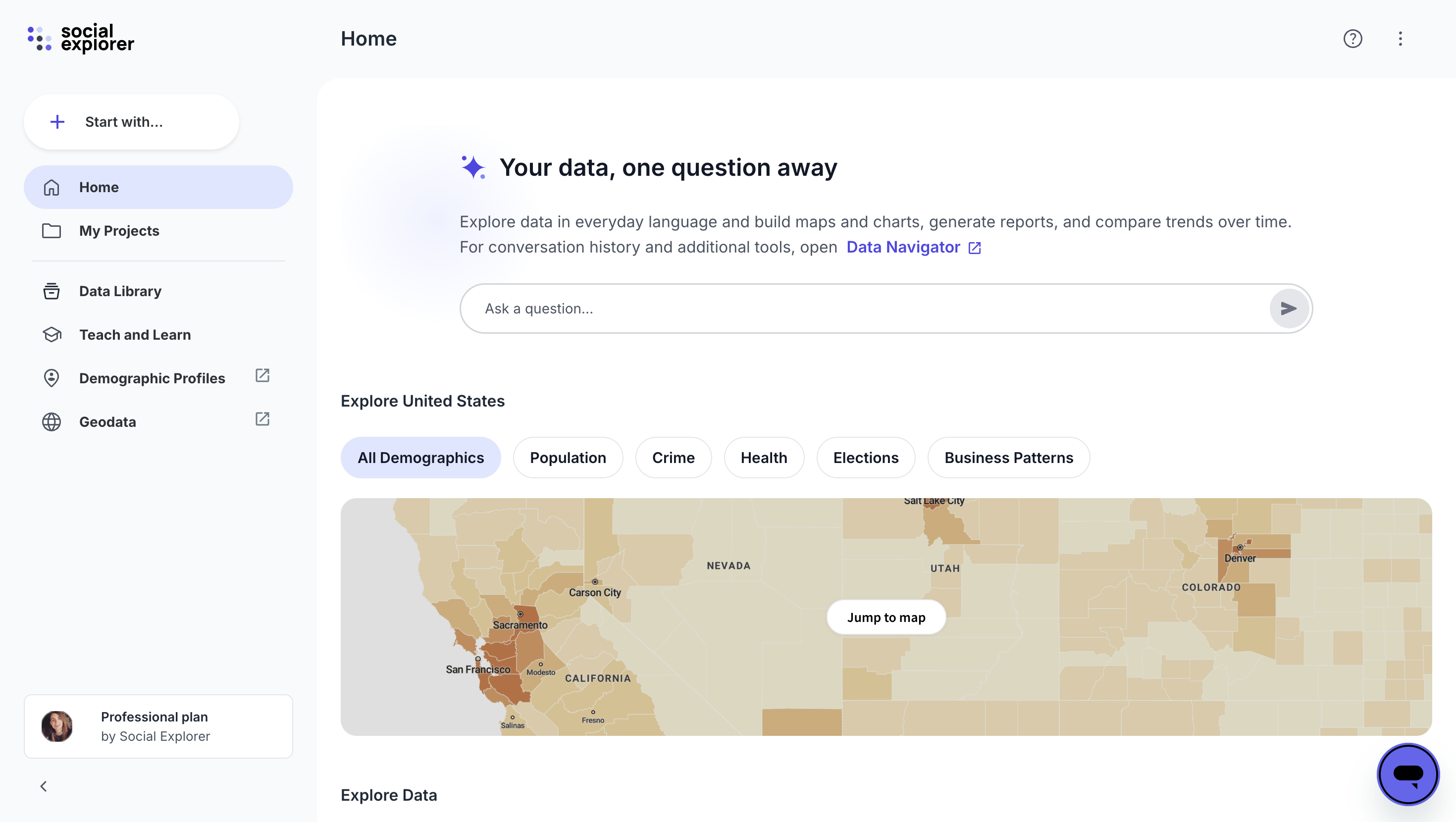 The Social Explorer Data Navigator is the main workspace, where you can ask questions, explore results, and manage your analyses. This article explains where to find the Data Navigator, how to open it, and how the interface is organized.