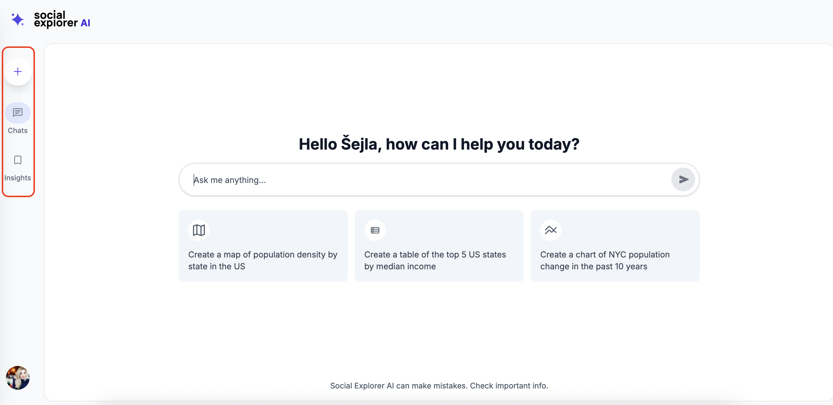 At the top of the left panel, the plus (+) button allows you to start a new chat. This creates a fresh conversation without affecting your previous questions or results.