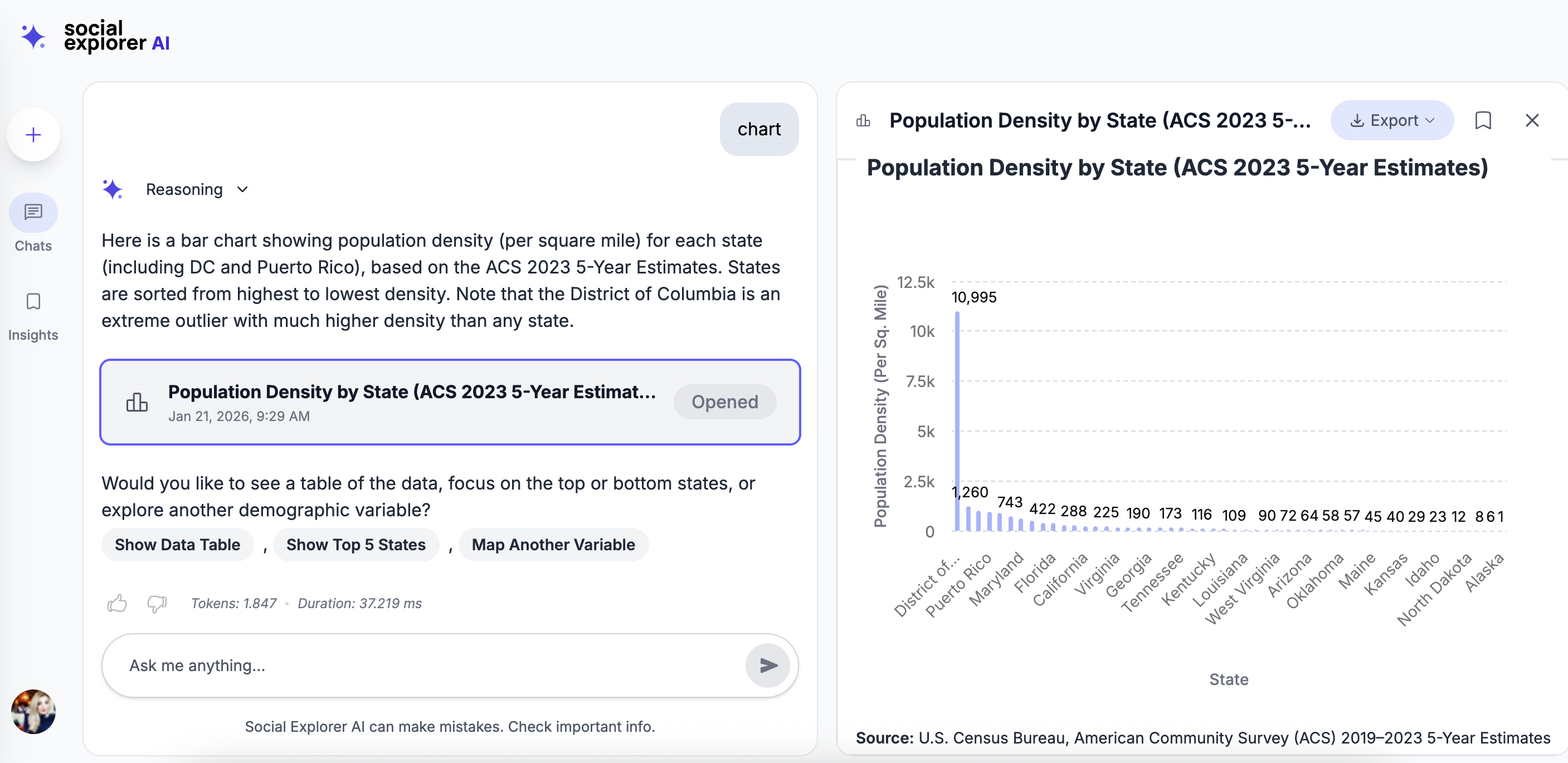 To understand data availability, geographic rules, and other constraints, see Limitations of the Social Explorer AI Assistant.