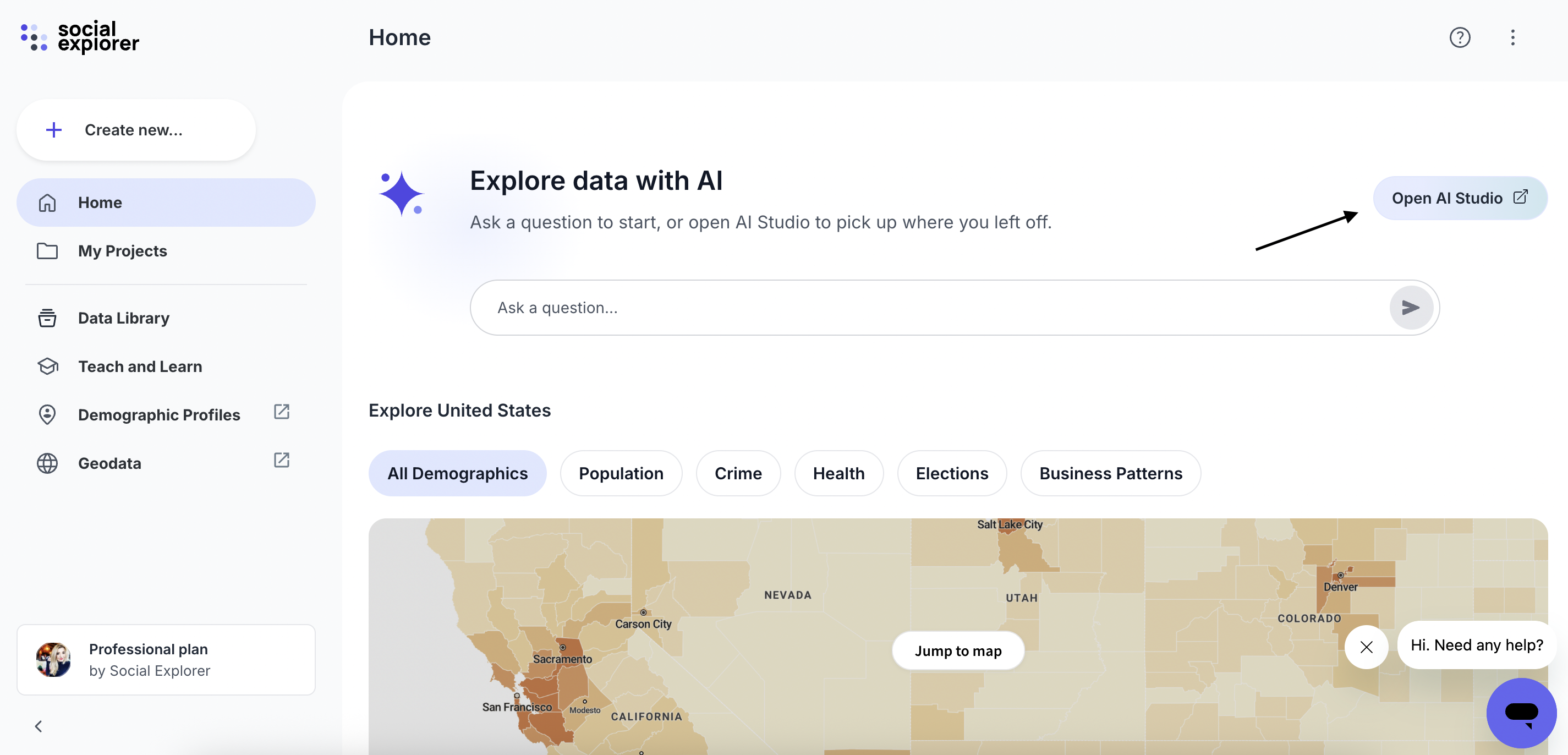 The Social Explorer AI Studio is the main workspace where you interact with Social Explorer AI, ask questions, explore results, and manage your analyses. This article explains where to find the AI Studio, how to open it, and how the interface is organized.