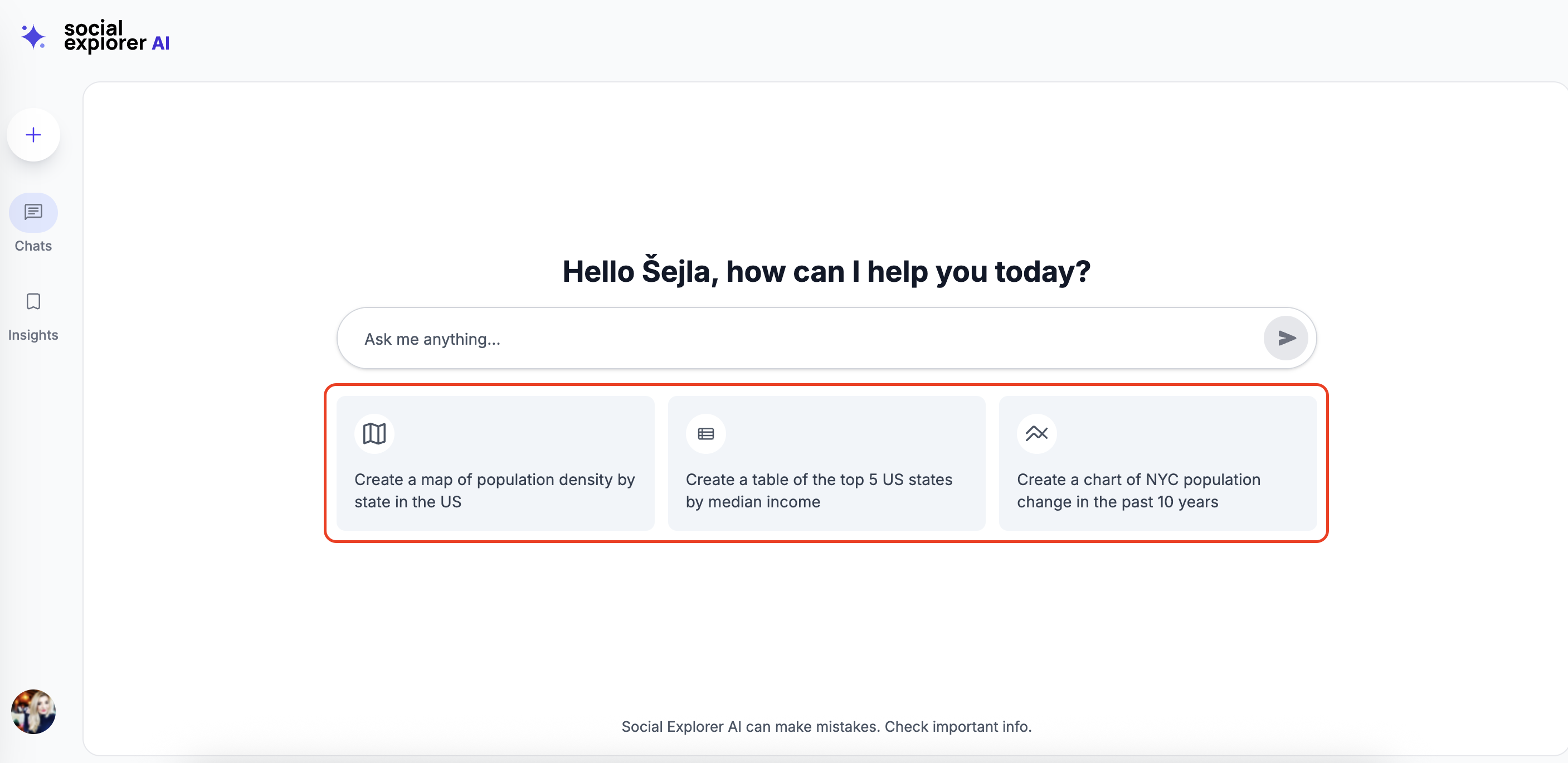 The Saved Insights section lets you save important outputs from your conversations, such as tables, charts, or maps.